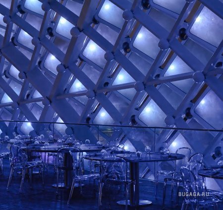 Отель представляет собой воплощение самых передовых идей в современном дизайне. Верхняя часть здания покрыта уникальной меняющей цвет конструкцией из стекла и металла. Она состоит из 5 тысяч отдельных панелей, подсвечивающихся особой светодиодной системой, создающей различные оттенки цвета. Это делает